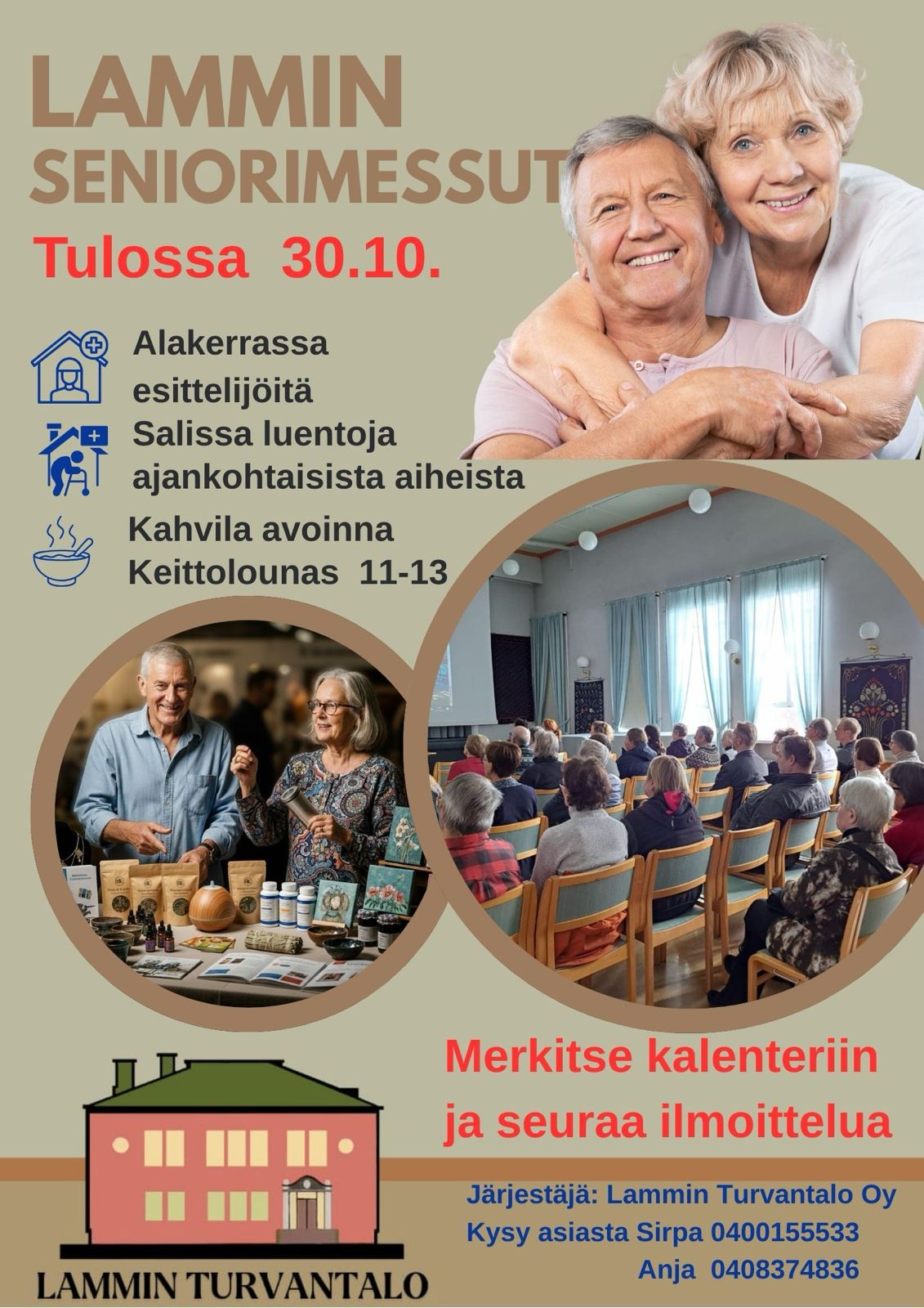 Lammin Seniorimessut torstaina 30.10.3035 klo 11-15, Kysy asiasta Sirpa 0400 1555 633 tai Anja 0400 837 4836